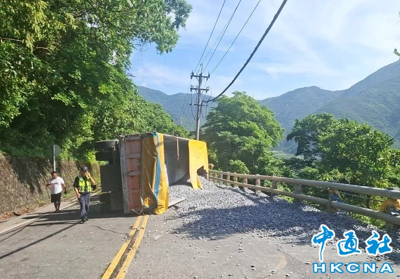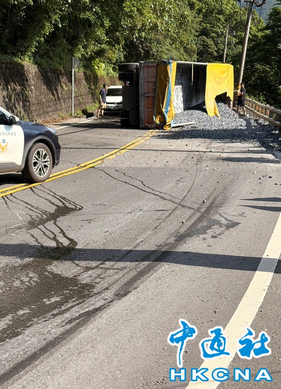 •   7月16日,台灣一輛滿載砂石的曳引車行經宜蘭縣蘇花公路台9線114.6K處,入彎道時疑因輪胎打滑,失控側翻,車斗內載運的砂石傾瀉一地,碎石擊中對向行駛而來的小客車擋風玻璃,所幸並未造成人員傷亡。 香港中通社圖片