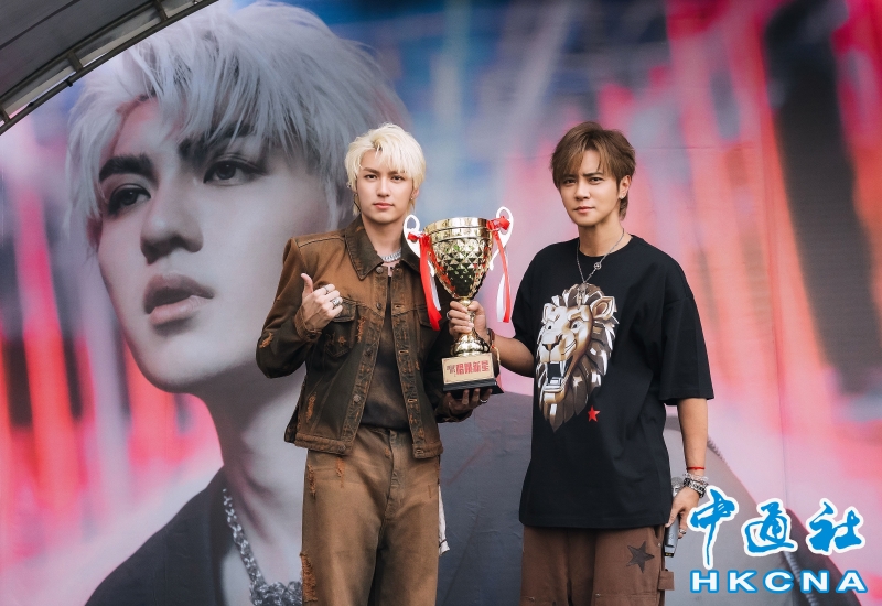 •   台灣男團C.T.O人氣成員薛恩7月19日在台中舉辦全台唯一一場新專輯《LEVEL UP》近距離簽名會,粉絲把握機會前往與偶像同歡,現場大爆場,突破千人。就連藝人羅志祥(右)也現身力挺愛徒,更送上象徵金牌的〔唱跳新星〕獎盃給薛恩,祝福他再創佳績。 香港中通社圖片
