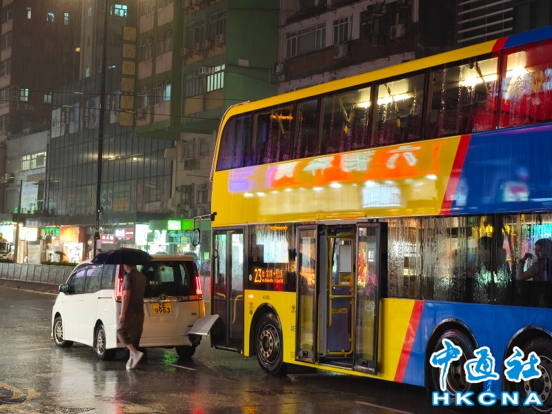 •   7月25日晚,香港天文台發紅色暴雨警告信號。因天雨路滑,一輛巴士與私家車在北角英皇道相撞,令交通一度受阻。 (香港中通社記者洪少葵攝)香港中通社圖片