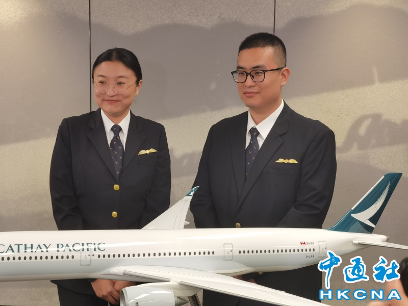 •   香港國泰航空28日舉行傳媒分享會,邀請首批加入國泰成為二級副機師的中國內地學員代表,分享自己的職業生涯。圖為國泰二副機師廉犖(左)、國泰二副機師孫鈺明。(香港中通社記者 譚暢攝) 香港中通社圖片