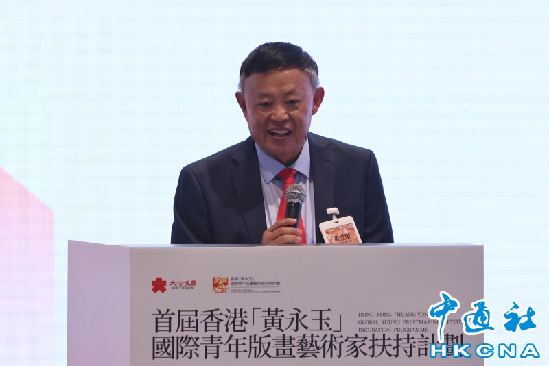 •   8月4日,首屆香港“黃永玉”國際青年版畫藝術家扶持計劃年度展覽舉行開幕禮。該計劃致力於挖掘和推薦中國青年藝術家,主要通過專業院校、機構推薦及藝術家自薦,每年為100位青年版畫藝術家提供以媒體為核心的全方位扶持,內容包括媒體報道及專訪、年度展覽、聯展、藝術創作等。圖為藝術家、黄永玉之子黃黑蠻致辭。(香港中通社記者  謝光磊 攝) 香港中通社圖片
