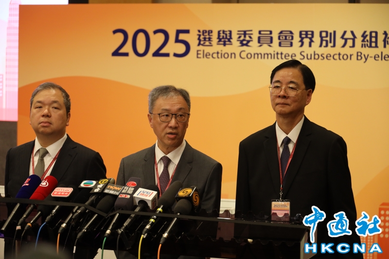 •   9月7日,香港2025選舉委員會界別分組補選當天舉行。圖為選舉管理委員會主席陸啟康法官(中)、委員石丹理教授(右)和文本立資深大律師巡視中央指揮中心及數據資訊中心後在設於香港會議展覽中心的新聞中心會見傳媒。(香港中通社記者洪少葵攝) 香港中通社圖片