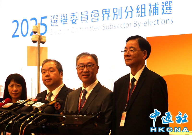 •   9月7日,香港2025選舉委員會界別分組補選當天舉行。圖為選舉管理委員會主席陸啟康法官(右二)、委員石丹理教授(右)和文本立資深大律師(左二)巡視中央指揮中心及數據資訊中心後在設於香港會議展覽中心的新聞中心會見傳媒。(香港中通社記者洪少葵攝) 香港中通社圖片