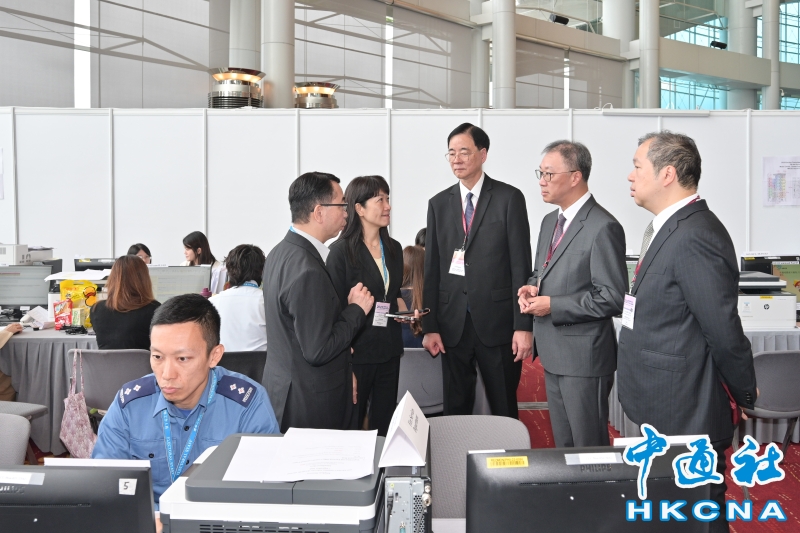 •   9月7日上午,香港特區選舉管理委員會主席陸啟康法官(後排右二)、委員石丹理教授(後排中)和文本立資深大律師(後排右一)在選舉事務處總選舉事務主任陳淑華(後排左二)和首席選舉事務主任(選舉)陳志成(後排左一)的陪同下,視察位於香港會議展覽中心的2005年選舉委員會界別分組補選中央指揮中心。 香港中通社圖片