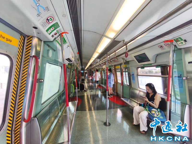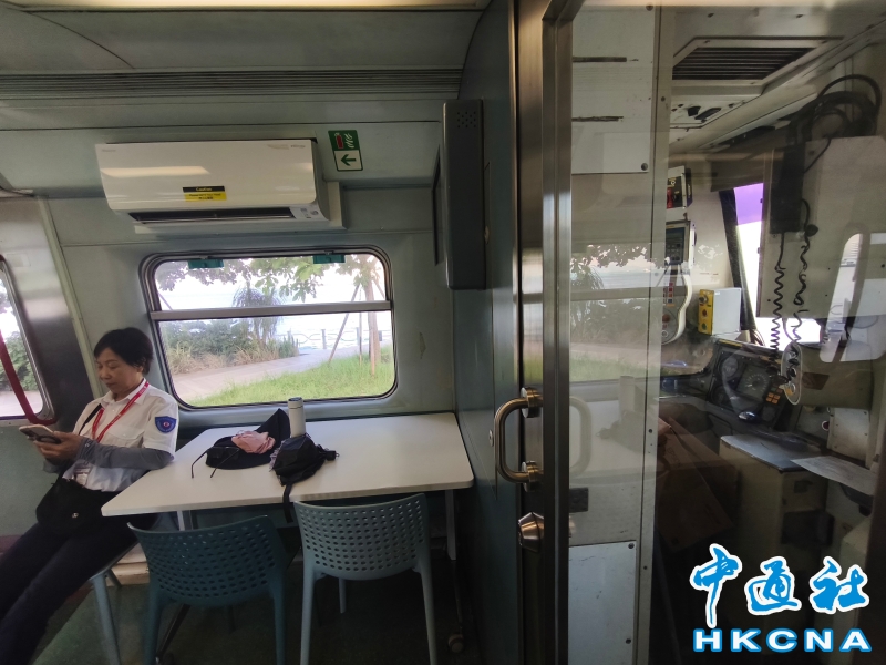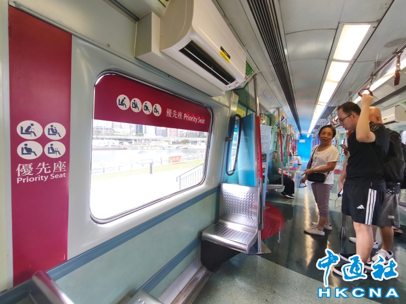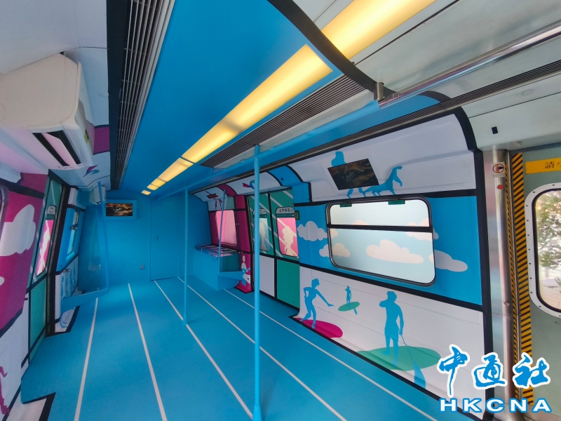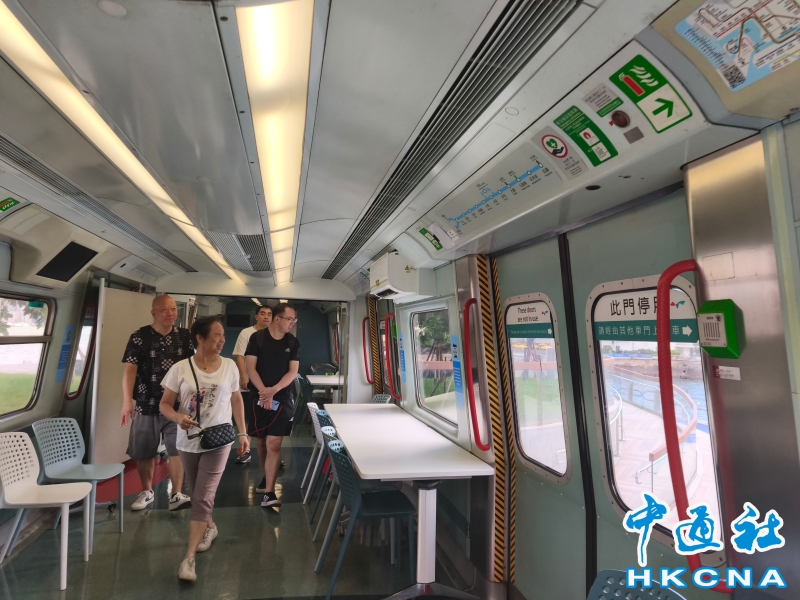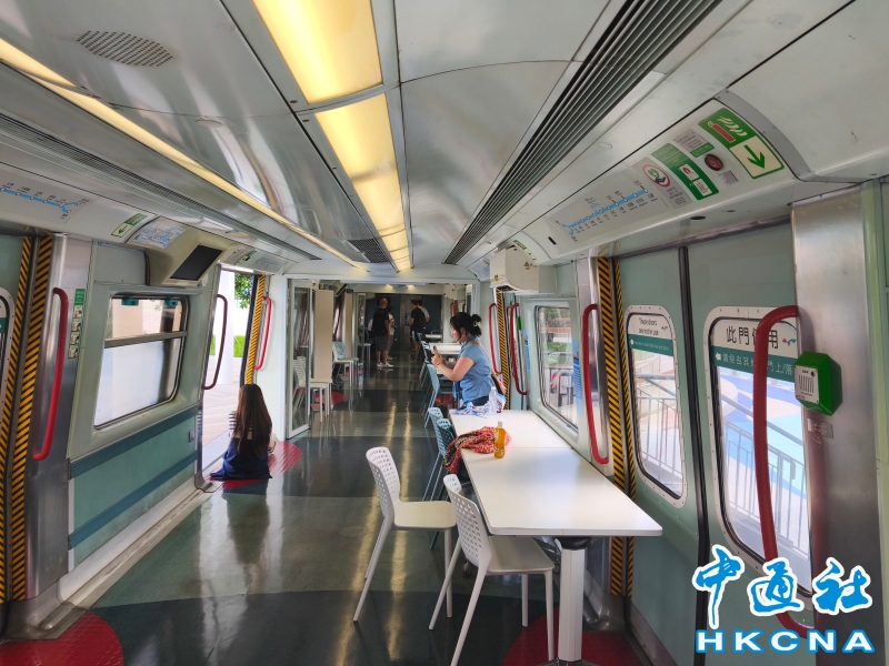 停泊在灣仔“水上運動及康樂主題區”兩卡已退役的東鐵線“烏蠅頭”列車,成為一個具香港特色的新地標和休憩空間。隨著港鐵不斷發展,港鐵公司透過“退役列車保傳計劃”,將兩卡已退役的“烏蠅頭”列車捐贈給發展局,並共同構思將這標誌性的列車重置於灣仔水上運動及康樂主題區,以作展示及公共活動空間。市民可通過新設的“海濱站”月台進入車廂,欣賞列車內裝,並在周邊的廣場、觀景台和夜光步道等設施休憩。車廂開放時間是上午10時至晚上10時,戶外的“海濱站”是24小時開放的休憩空間。圖為車廂內景。 香港中通社圖片