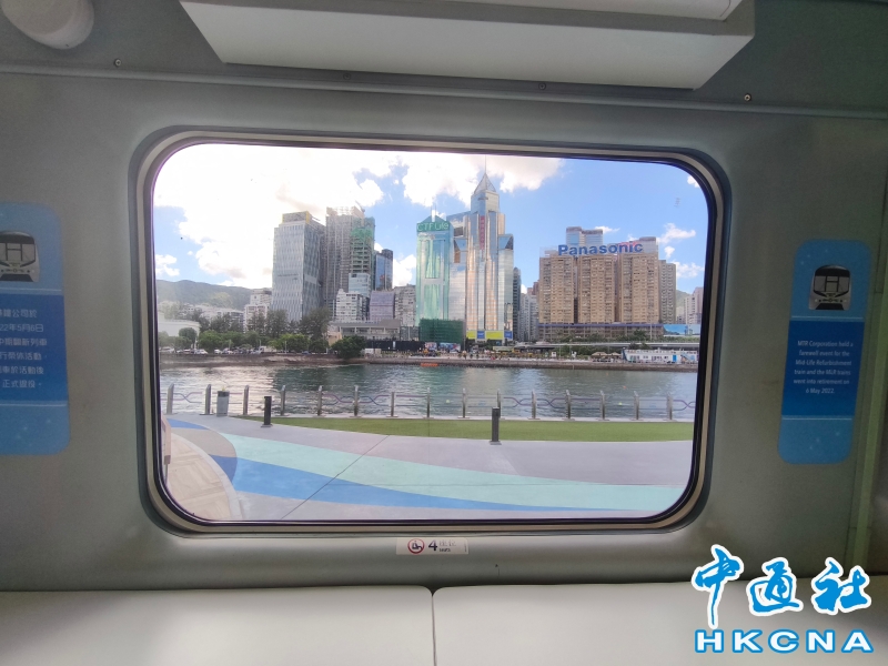 停泊在灣仔“水上運動及康樂主題區”兩卡已退役的東鐵線“烏蠅頭”列車,成為一個具香港特色的新地標和休憩空間。隨著港鐵不斷發展,港鐵公司透過“退役列車保傳計劃”,將兩卡已退役的“烏蠅頭”列車捐贈給發展局,並共同構思將這標誌性的列車重置於灣仔水上運動及康樂主題區,以作展示及公共活動空間。重置的退役列車亦紀念東鐵綫順利延伸過海直連港島,成為香港第四條過海鐵路。圖為列車車窗外望灣仔。香港中通社圖片