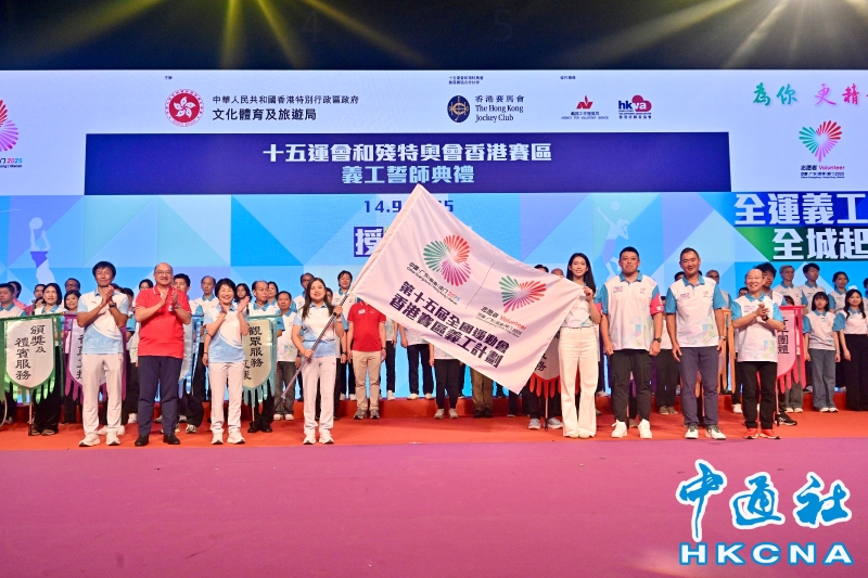•   第十五屆全國運動會和全國第十二屆殘疾人運動會暨第九屆特殊奧林匹克運動會香港賽區義工誓師典禮9月14日在伊利沙伯體育館舉行。圖為(前排左起)全國運動會香港賽區統籌辦公室主任楊德強、香港賽馬會公司事務執行總監譚志源、文化體育及旅遊局常任秘書長沈鳳君、文化體育及旅遊局局長羅淑佩、義工大使江旻憓、梁國成、香港志願者協會主席郭永亮、義務工作發展局副主席黃江天博士,以及一眾義工代表在授旗儀式上。 香港中通社圖片