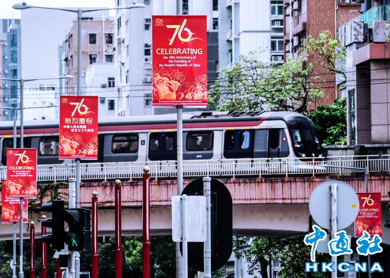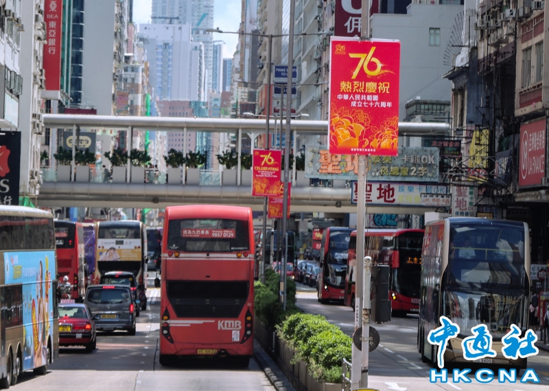 •   臨近國慶節,香港旺角街頭掛滿了慶祝中華人民共和國成立76周年標語,國慶氛圍漸濃。(香港中通社記者 徐文峰攝) 香港中通社圖片