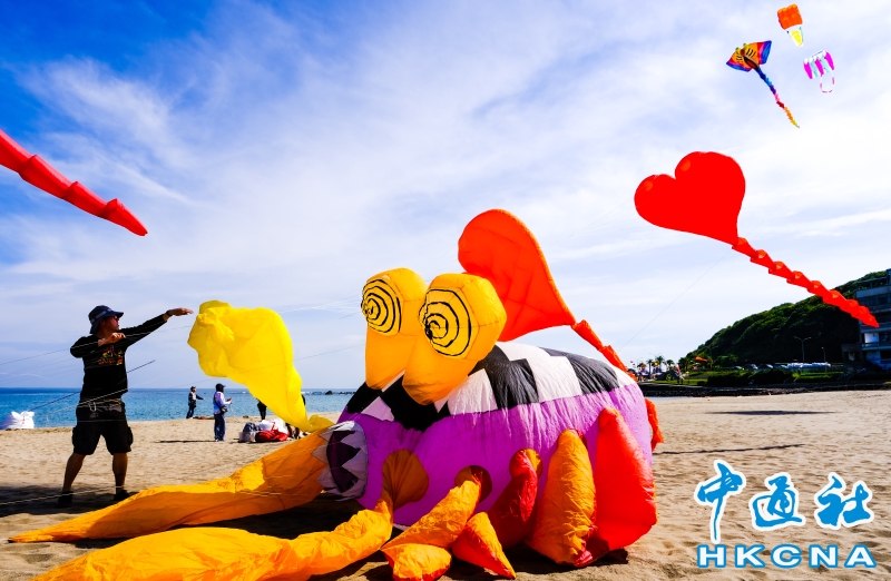 台灣“2025新北市北海岸國際風箏節”於9月20日於新北市石門區白沙灣登場,今年以“追風.迎豐”為活動主軸,來自世界各地的熱愛風箏人士一同共襄盛舉,攜手打造空中的豐收慶典活動,除了有世界各地的特色造型風箏、軟體風箏、特技風箏外,通過亮相競技觀摩,促成相互交流,讓北海岸的天空亮麗耀眼起來。今年風箏節以“海洋生物”為設計主軸,有鯨魚、海螺、獅子魚、章魚…等各式各樣可愛造型風箏升空,其中包含巨型章魚風箏、大型鯨魚風箏及首次在白沙灣亮相的“獅子魚”等大型風箏亮相,讓北海岸天空增添視覺震撼。各式各樣的風箏,翩翩起舞讓北海岸的天空變得多彩多姿。 香港中通社圖片