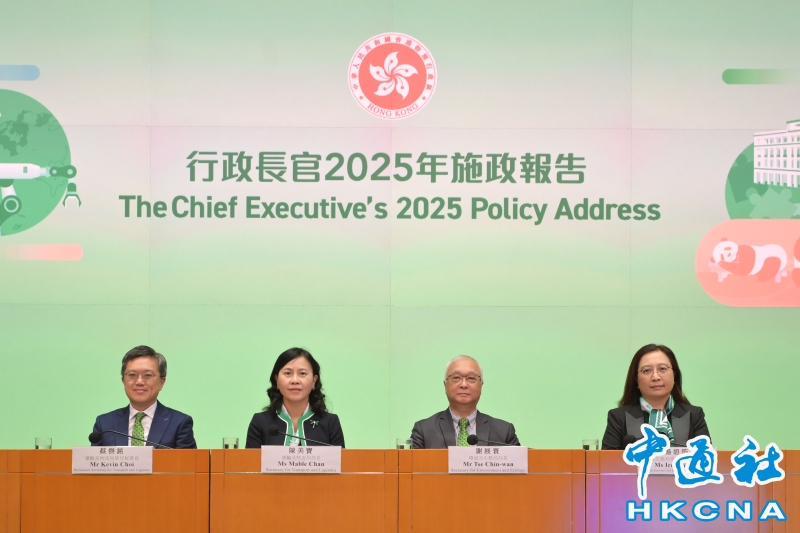 •   9月21日,香港特區環境及生態局局長謝展寰(右二)、運輸及物流局局長陳美寶(左二)、環境及生態局常任秘書長(食物)楊碧筠(右一)和運輸及物流局常任秘書長蔡傑銘(左一)舉行記者會,闡述《行政長官2025年施政報告》相關措施。 香港中通社圖片