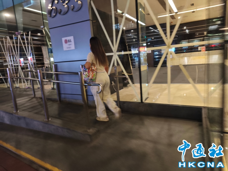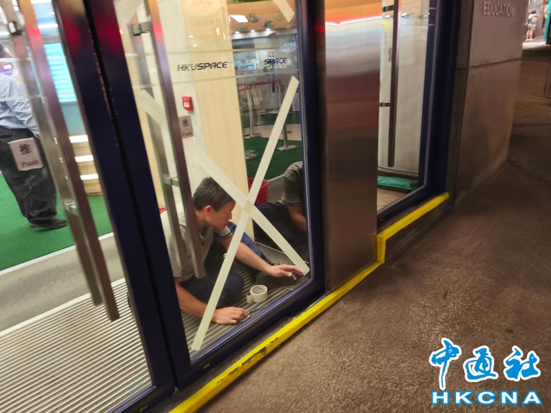 •   9月22日,香港天文台晚上9時40分改發三號 籲市民採取適當預防措施。圖為商廈粘貼膠帶抵擋風雨。 香港中通社圖片