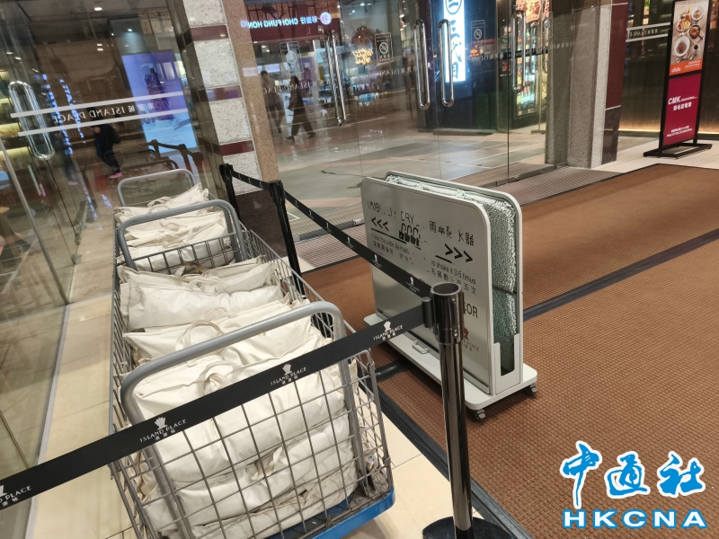 •   9月22日,香港天文台晚上9時40分改發三號 籲市民採取適當預防措施。圖為一家商場準備了沙袋用來抵擋風雨。 香港中通社圖片