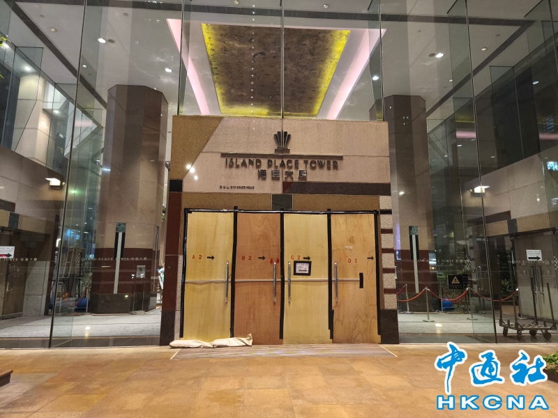•   9月22日,香港天文台晚上9時40分改發三號 籲市民採取適當預防措施。圖為商廈大門用木板封閉抵擋風雨。 香港中通社圖片
