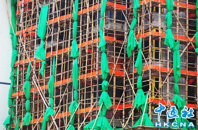 •   9月23日,超強颱風“樺加沙”撲港,有建築地盤捆綁建築網,預防強風吹襲。(香港中通社記者洪少葵攝) 香港中通社圖片
