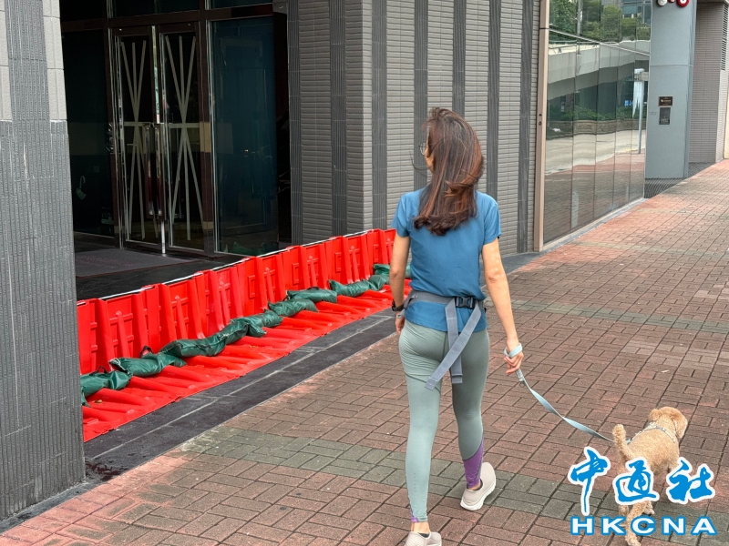 •   9月23曰,面對來勢凶凶的颱風”樺加沙””,香港深水埗一住宅在門外堆起防水堤,預防淹水。圖為市民趁風暴來臨前趕緊溜狗。(香港中通社記者 徐文峰攝) 香港中通社圖片