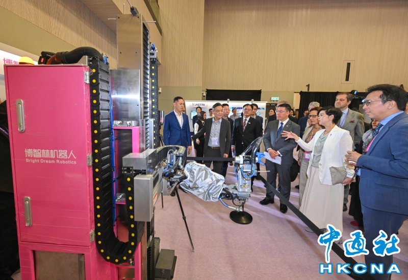 •   11月4日,香港房屋局局長何永賢出席房屋局與香港房屋委員會舉辦的“共築.智能峰會”。圖為何永賢(右二)與其他嘉賓參觀會場內的機械人展示區,並和與會人士互動交流。 香港中通社圖片