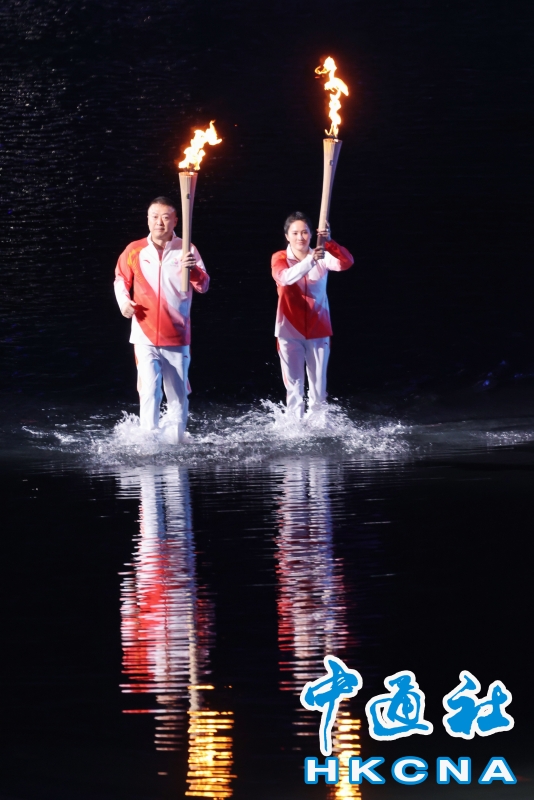 •   11月9日晚,第十五屆全國運動會開幕式在廣東奧林匹克體育中心舉行。圖為火炬手馬琳(左)、陳若琳傳遞火炬。(香港中通社記者 謝光磊 攝) 香港中通社圖片