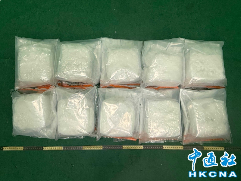 •   11月10日,香港海關公佈於11月8日在香港國際機場破獲一宗毒品案件,檢獲約十公斤懷疑冰毒,估計市值約五百四十萬元。圖為檢獲的懷疑冰毒。 香港中通社圖片