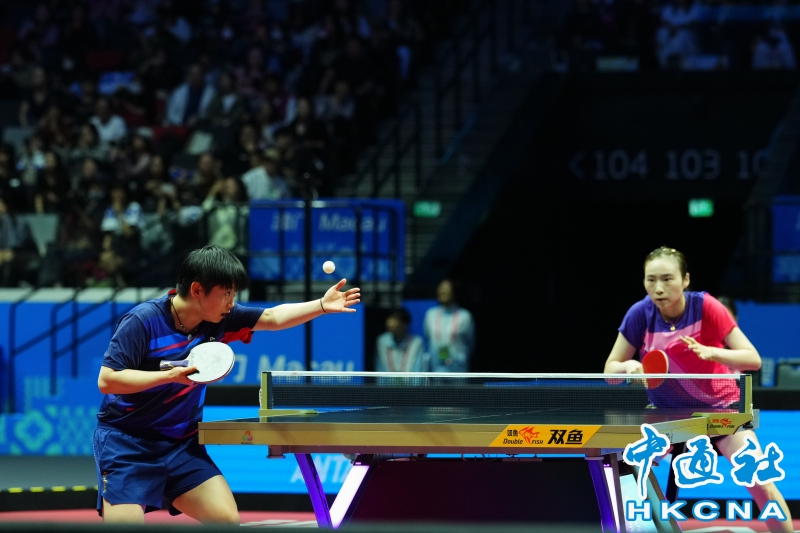 •   11月12日,河北隊孫穎莎(左)在澳門銀河綜藝館舉行的第十五屆全國運動會乒乓球女子單打比賽中,以4比1戰勝山東隊王曉彤,晉級八強。 香港中通社圖片