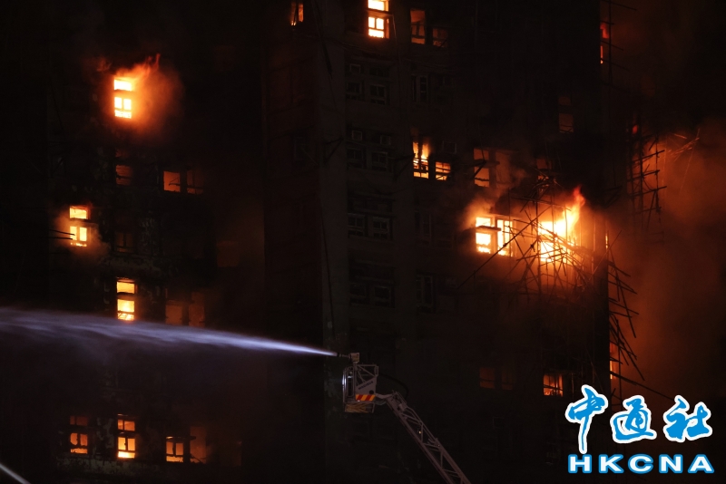 •   11月26日,香港大埔宏福苑發生五級火警,宏昌閣外牆棚架率先起火,其後蔓延至宏泰閣及宏新閣等大廈。火警造成13死15傷。(香港中通社記者  謝光磊 攝) 香港中通社圖片