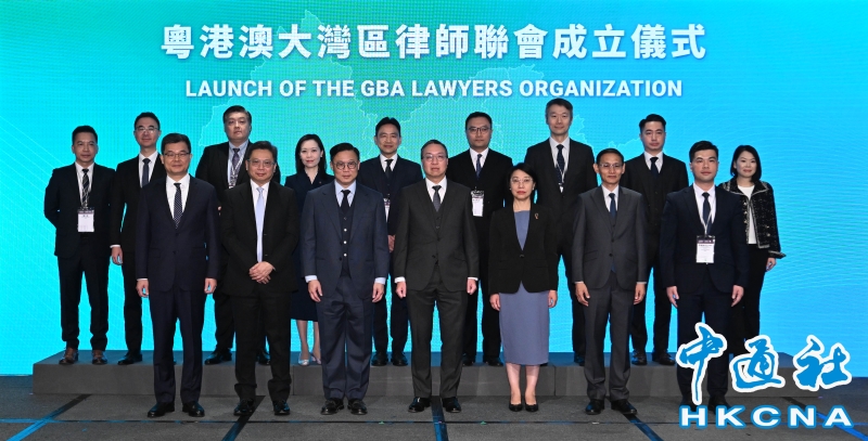 •   12月5日,粵港澳大灣區律師聯會在香港法律周2025—第一屆粵港澳大灣區律師論壇上正式成立。圖為律政司司長林定國資深大律師(前排中)、律政司副司長張國鈞博士(前排左三)、粵港澳大灣區律師聯會籌備辦公室代表、中國法律服務(香港)有限公司董事長劉長春(前排右三),以及粵港澳大灣區律師聯會主席曹紹基(前排左二)與聯會成員合照。 香港中通社圖片