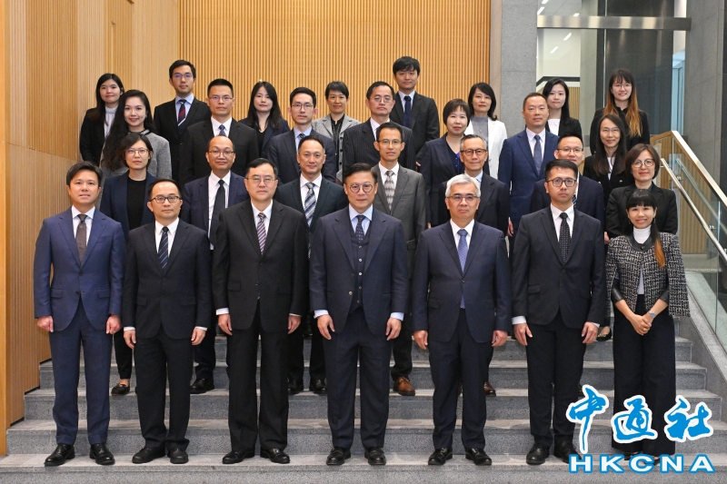 •   12月9日,香港律政司副司長張國鈞博士主持第七次粵港澳大灣區法律部門聯席會議。圖為張國鈞博士(前排中)、廣東省司法廳廳長陳旭東(前排左三)和澳門特別行政區政府行政法務司司長黃少澤(前排右三)和三地法律部門人員出席會議前合照。 香港中通社圖片