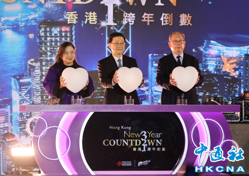 •   1月1日凌晨,香港跨年倒數活動踏入高潮,香港特別行政區行政長官李家超與文化體育及旅遊局局長羅淑佩、旅發局主席林建岳一同主持倒數啟動儀式,中環8幢地標建築上演精彩的光影表演,標誌著2026年的正式到來。圖為中環上演光影表演。香港特別行政區行政長官李家超(中),文化體育及旅遊局局長羅淑佩(左),旅發局主席林建岳(右)主持儀式。(香港中通社記者 鄧梓傑 攝) 香港中通社圖片