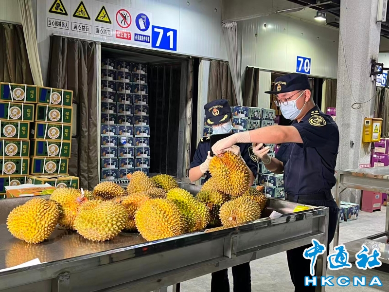 •     圖為中國海關關員正在對柬埔寨進口榴蓮進行查驗。 香港中通社圖片