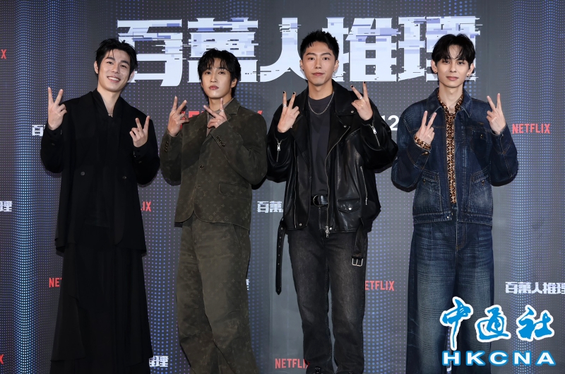 •   NETFLIX影集“百萬人推理”即將在2月12日上線,2月6日在台北NUZONE展演空間舉行上線記者會。圖為〈左起〉詹懷雲、婁峻碩、蔡凡熙、楊懿軒出席“百萬人推理”影集上線記者會。 香港中通社圖片