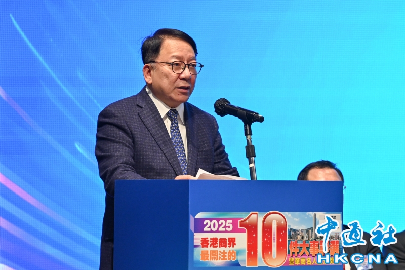 •   2月10日,香港特區政府政務司司長陳國基在“2025香港商界最關注的十件大事”評選頒獎典禮致辭。 香港中通社圖片