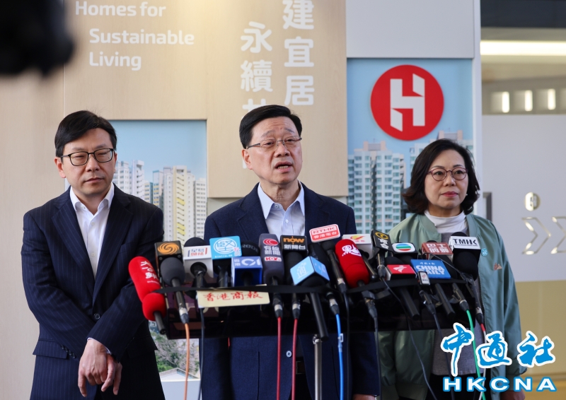 •   2月13日,香港特區行政長官李家超落區油麻地進行歲晚探訪活動,探訪結束後與官員一起會見傳媒。(香港中通社記者 鄧梓傑 攝) 香港中通社圖片