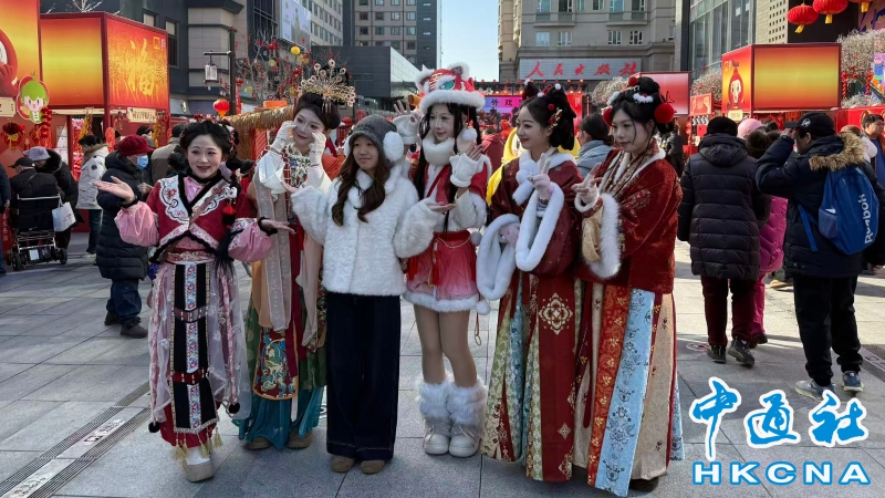 •     2026年2月11日,“馬不停蹄新春潮集”正在北京東城區隆福寺廣場舉行,隆福寺廣場人流如織。圖為遊客與穿著中國古代傳統服飾的女孩們合照留念。 香港中通社圖片