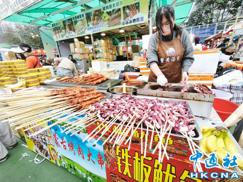 •   全港最大的2026維園年宵市场设有400个摊档,方便市民购买贺年花卉、食品、装饰和挥春等,迎接新年。圖為年宵市場快餐攤位。 香港中通社圖片