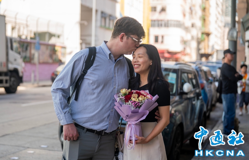 •   2月14日情人節,旺角花墟鮮花銷售暢旺,花店擺滿了應節的鮮花,吸引了大批市民前來選購。圖為收到鮮花的女士露出幸福的笑容。(香港中通社記者 陳奕啟 攝) 香港中通社圖片