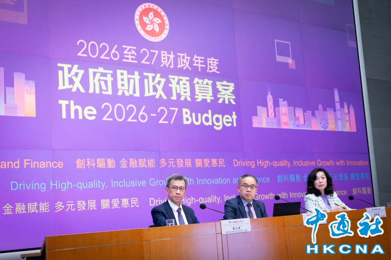 •   2月26日,香港特區財經事務及庫務局(財庫局)局長許正宇(中)舉行二零二六至二七年度《財政預算案》財庫局相關措施記者會。財庫局常任秘書長(財經事務)甄美薇(右)和財庫局常任秘書長(庫務)黎志華(左)亦有出席。 香港中通社圖片