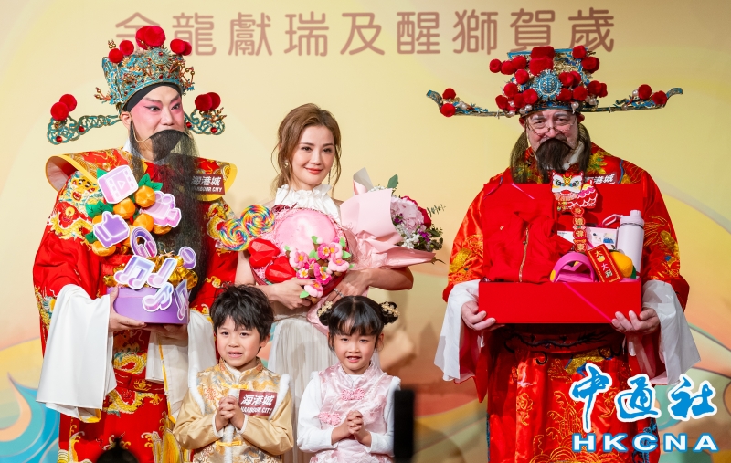 •   3月2日,香港海港城舉辦“金龍獻瑞及醒獅賀歲”活動。藝人蔡卓妍(阿Sa)擔任主禮嘉賓,擊鼓馬年開運,與現場市民共迎新春。圖為蔡卓妍與財神及小朋友們合照。(香港中通社記者 陳奕啟 攝) 香港中通社圖片