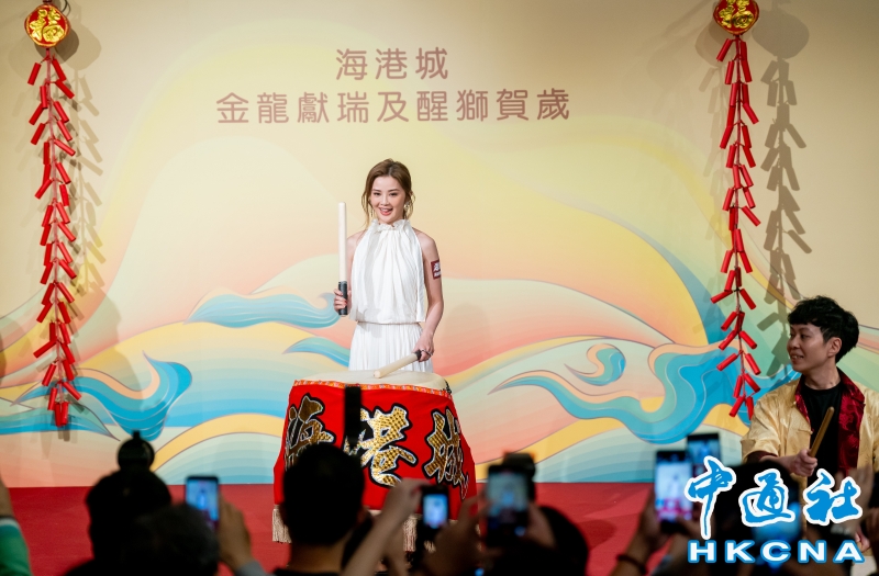•   3月2日,香港海港城舉辦“金龍獻瑞及醒獅賀歲”活動。藝人蔡卓妍(阿Sa)擔任主禮嘉賓,擊鼓馬年開運,與現場市民共迎新春。圖為蔡卓妍擊鼓開運。(香港中通社記者 陳奕啟 攝) 香港中通社圖片