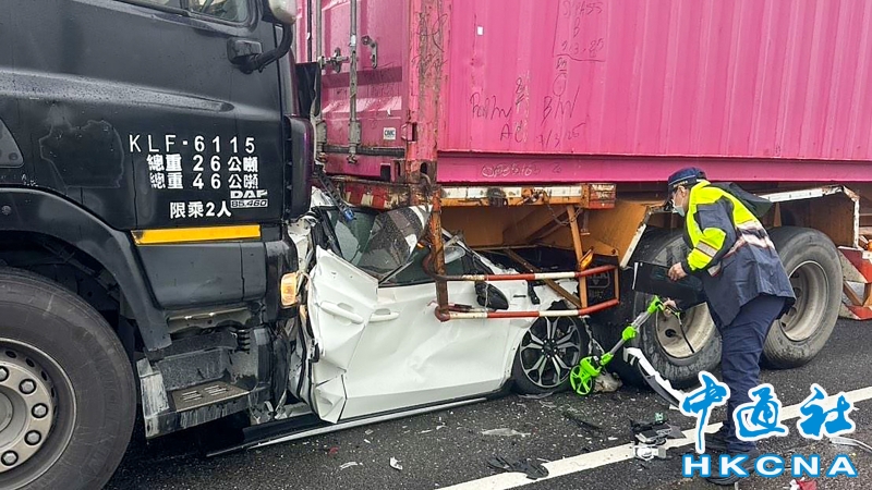 •   3月3日台灣第一高速公路高雄路竹路段發生一起死亡車禍,1輛貨櫃車追撞1輛自小客車,自小客車再推撞前方貨櫃車,造成自小客車被兩輛貨櫃車夾擊,駕駛郭姓男子被救出送醫急救不治,全案由警方調查處理中。 香港中通社圖片