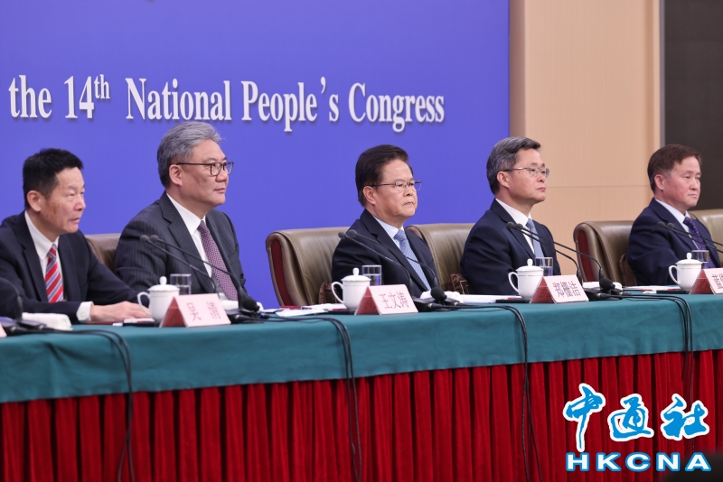 •   3月6日,十四屆全國人大四次會議舉行經濟主題記者會,國家發展和改革委員會主任鄭栅潔、財政部部長藍佛安、商務部部長王文濤、中國人民銀行行長潘功勝、中國證券監督管理委員會主席吳清就發展改革、財政預算、商務、金融證券等相關問題回答中外記者提問。(香港中通社記者  謝光磊 攝) 香港中通社圖片