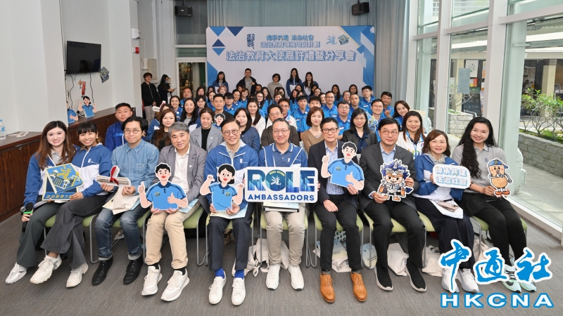 •   3月7日,香港律政司舉行法治教育領袖培訓計劃法治教育大使嘉許禮暨分享會。圖為律政司司長林定國資深大律師(第一排右五)、律政司副司長張國鈞博士(第一排左五)、保安局局長鄧炳強(第一排右四)、善導會執行委員會主席潘兆童法官(第一排左四)與學員及其他嘉賓合照。 香港中通社圖片