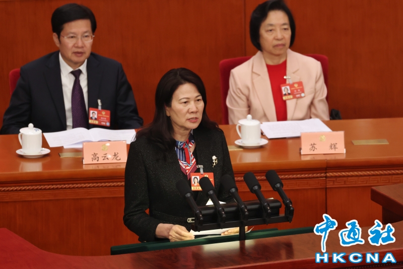 •   3月7日,全國政協十四屆四次會議在北京人民大會堂舉行第二次全體會議。圖為霍金花委員代表民盟中央作題為《夯實底層技術 加快建設製造強國》的發言。(香港中通社記者  謝光磊 攝) 香港中通社圖片