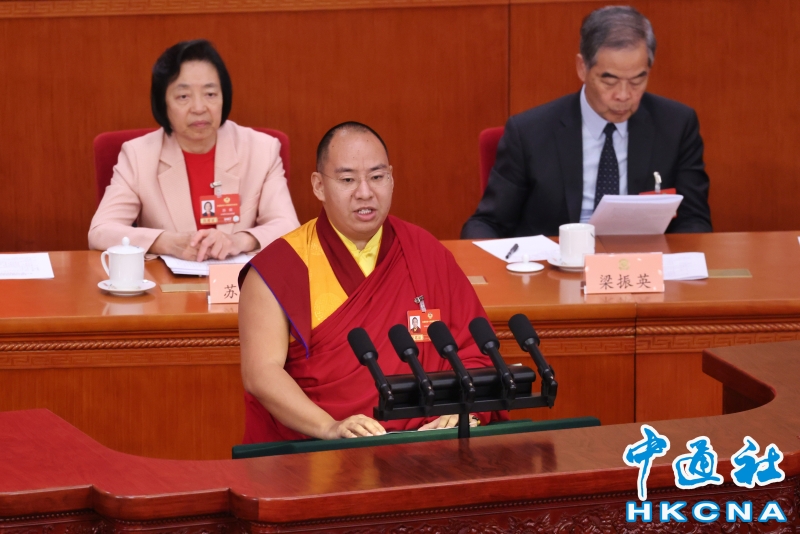 •   3月8日,全國政協十四屆四次會議在北京人民大會堂舉行第三次全體會議。圖為班禪額爾德尼·確吉傑布委員作題為《積極推進宗教與社會主義社會相適應 為中華民族偉大復興貢獻力量》的發言。(香港中通社記者  謝光磊 攝) 香港中通社圖片
