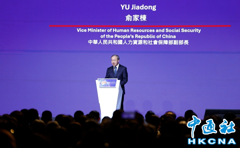 •   3月18日,全球人才高峰會周在香港灣仔會議展覽中心開幕。高峰會周聚焦促進區域人才交流,展示多元發展機遇,匯聚政商學界領袖灼見,共同探索未來人才趨勢。圖為中華人民共和國人力資源和社會保障部副部長俞家棟致辭。(香港中通社記者 陳奕啟 攝) 香港中通社圖片