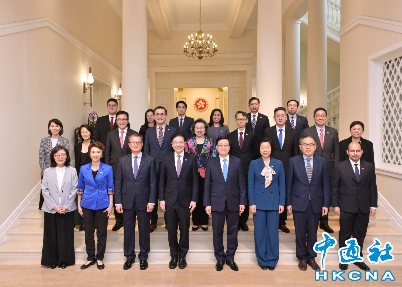 •   3月27日,香港特區行政長官李家超(第一排右四)在禮賓府與訪港的新加坡總理兼財政部長黃循財(第一排左四)會面。 香港中通社圖片