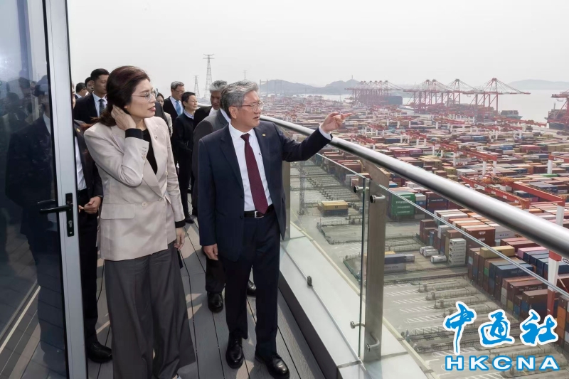 •   中國國民黨主席鄭麗文(左)一行9日參訪上海洋山港。 香港中通社圖片