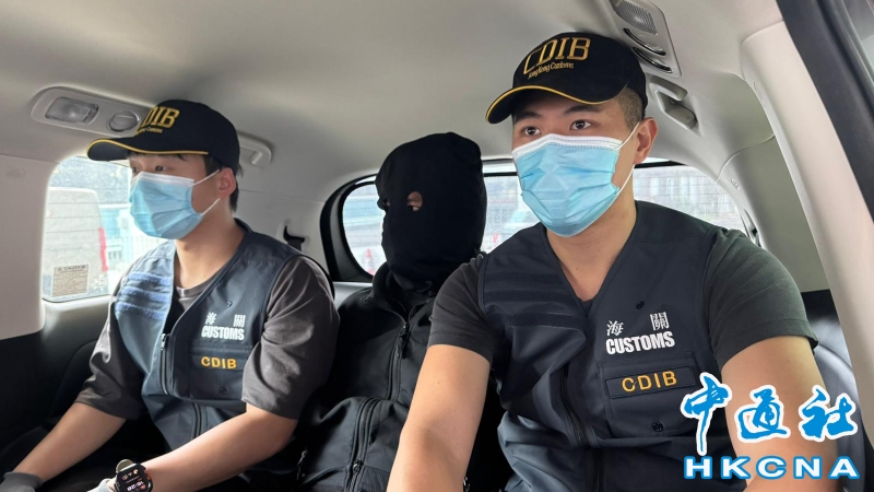 •   香港海關昨日(4月9日)在香港國際機場偵破一宗行李藏毒的販毒案件,檢獲約1.56公斤懷疑海洛英,估計市值約一百萬港元。圖為涉案的被捕人士(中)。 香港中通社圖片