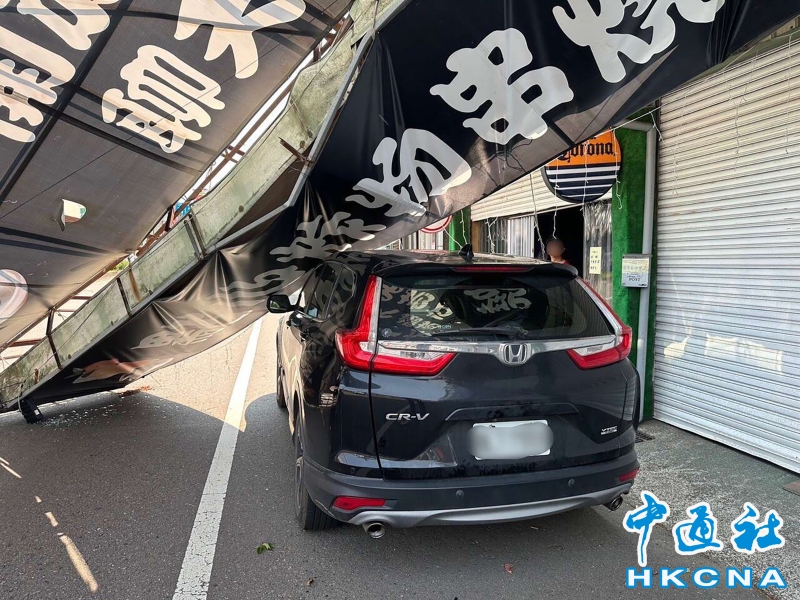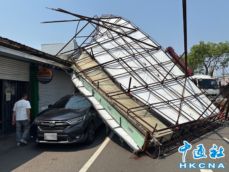 •   4月10日下午,台灣桃園市龍潭區中豐路,一磈大型帆布廣告牌掉落砸中停在路邊的汽車,所幸無人傷亡。 香港中通社圖片