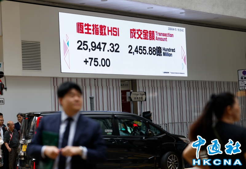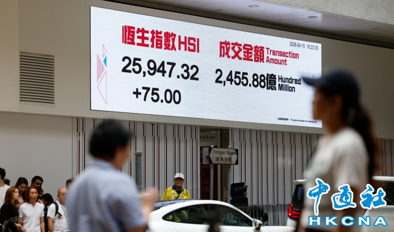 •   4月15日,截至收盤,香港恆生指數升75點,升幅0.29%,報25947.32點,主板全天成交2455.88億港元。(香港中通社記者 陳奕啟 攝) 香港中通社圖片