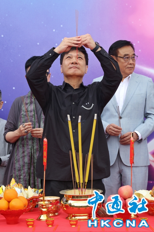 •   第四十四屆香港電影金像獎頒獎典禮即將舉行,4月17日,香港電影金像奬協會董事局主席爾冬陞率領一眾工作人員及業界代表在文化中心外進行傳統的拜神儀式,祈求典禮順利完成。圖為藝人錢嘉樂出席拜神儀式。(香港中通社記者  謝光磊 攝) 香港中通社圖片