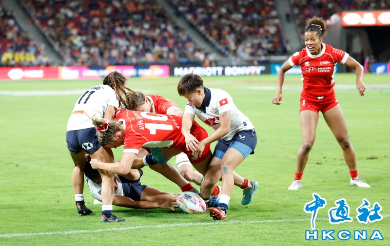 •   4月17日,2026年香港國際七人欖球賽在香港啟德主場館舉行。圖為女子香港隊(白)對丹麥隊 。(香港中通社記者 陳奕啟 攝) 香港中通社圖片